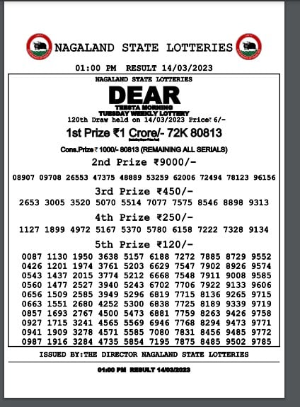 Nagaland State Dear Lottery Sambad Tuesday, March 14, 2023 Today 1 PM, Winners Ticket Number List LIVE