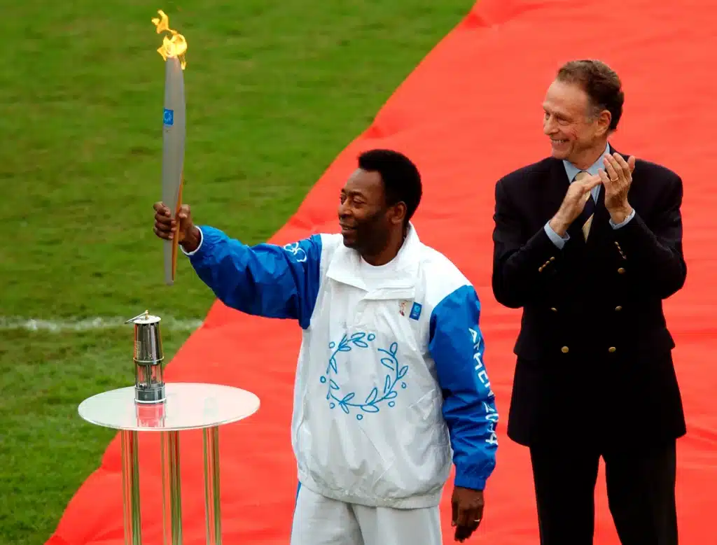 Pele, left, holds the Olympic torch as Arthur Nuzman, president of Brazil’s Olympic Committee, right, applauds at the Maracana stadium in Rio de Janeiro, June 13, 2004.