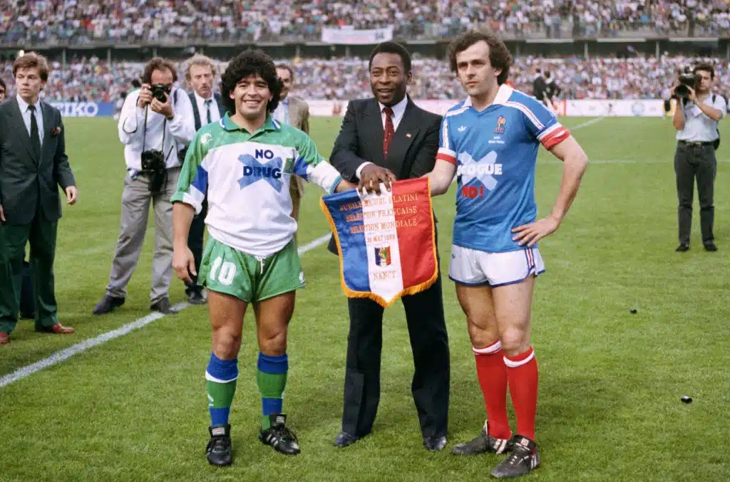 Argentina’s Diego Maradona, left, Pele of Brazil, centre, and France’s Michel Platini pose shaking hands during Platini’s jubilee at Nancy stadium, eastern France.
