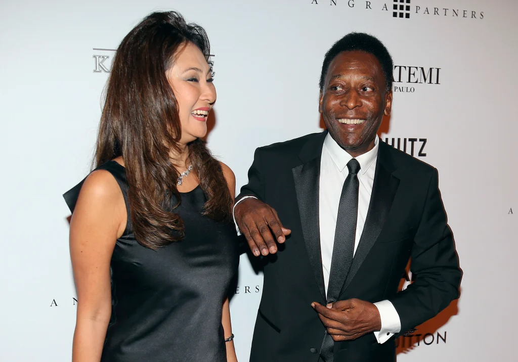 In this photo taken on April 5, 2013, Pele and businesswoman Marcia Cibele Aoki pose on the red carpet of The Foundation for AIDS Research event in Sao Paulo, Brazil. The 75-year-old Pele married Aoki at a ceremony on July 9, 2016, in the resort of Guaruja, near Sao Paulo.