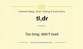 TL;DR (also sometimes seen without the semicolon as TLDR) means “too long; didn’t read.” It’s an abbreviation that you’ll frequently find at the end of internet communications, usually ones with a lot of text. It’s a phrase that basically means “summary” and is followed by a short, one- or two-line overview for people who may not have read every word of a long chunk of text. It’s a sort of ICYMI (internet speak for “in case you missed it”) tacked onto the end of an online post, email or another form of communication. TLDR meaning- what does TLDR mean?