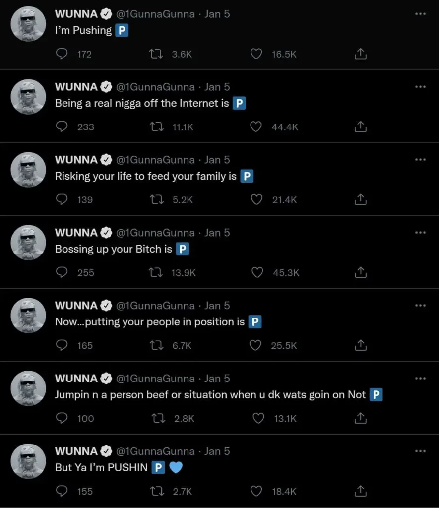 In January 2022, Gunna, an Atlanta-based rapper, collaborated with fellow artists Future and Young Thug to release the single “Pushin P.” The song quickly gained popularity and became a viral trend on TikTok, with the lyrics being posted on various social media platforms such as Twitter and Instagram stories.