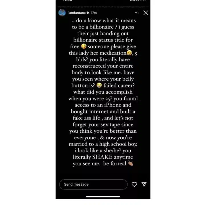 “Do you even understand what it means to be a billionaire? It seems like they’re just giving out the billionaire title for free. Someone please get this lady her medication because she’s clearly in need. You’ve literally transformed your entire body to resemble me. Have you seen where your belly button is located? Failed career? What did you achieve when you were 25? You stumbled upon an iPhone, bought internet access, and constructed a fake life. Let’s not forget about your sex tape since you think you’re superior to everyone else. And now you’re married to a high school boy. I resemble a ‘she he’? You visibly tremble whenever you see me. Let’s be honest.”