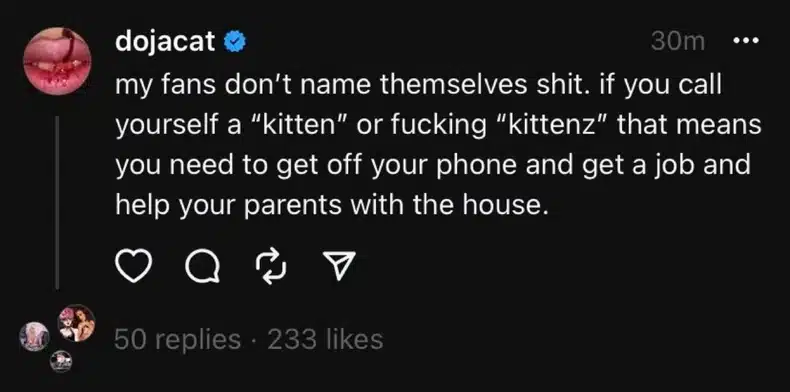 This occurred when she lambasted them across social media platforms, objecting to them referring to themselves as ‘Kittenz.’ Doja Cat, known for her provocative nature, deleted the posts later. In response to her fans’ attempts to name themselves, she harshly advised them to get jobs and help their parents instead.