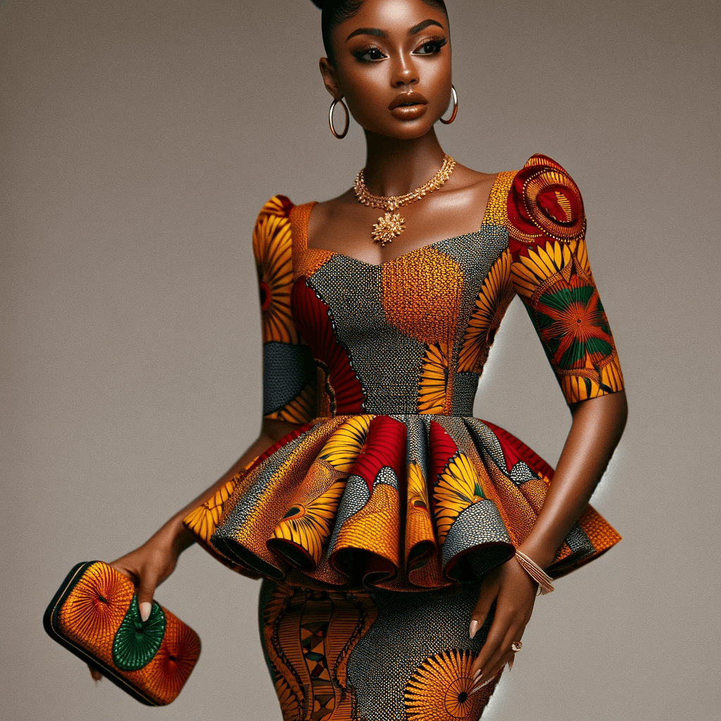 A straight-cut Ankara peplum gown cinches at the waist and flares at the hips, embodying elegance while highlighting the waistline. With the addition of a slit in a maxi skirt, movement becomes effortless and stylish.