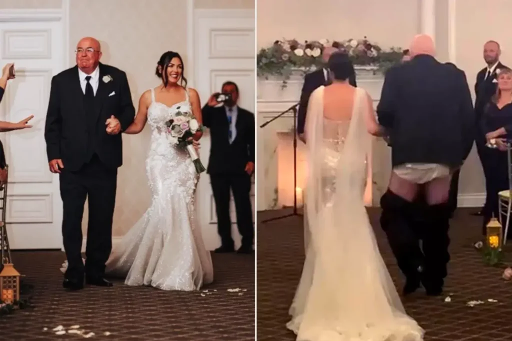 Captured in a TikTok video, Sarah, 36, humorously advises future brides, “Make sure whoever is walking you down the aisle is wearing suspenders for this one reason.” The video shows her 74-year-old dad walking her down the aisle when suddenly his pants fell to the floor.