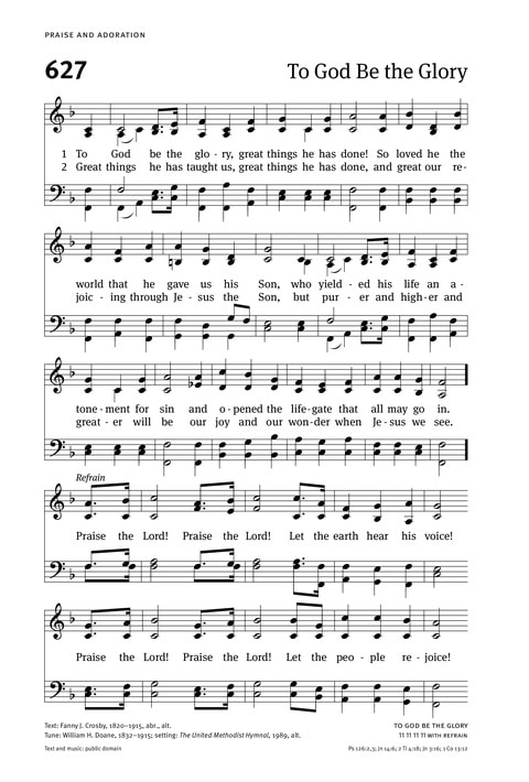 “To God Be the Glory” is a hymn credited to Fanny Crosby for its lyrics and William Howard Doane for its melody, first appearing in print in 1875.