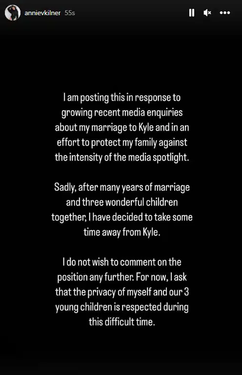 In her statement, Annie expressed her desire to shield her family from intense media scrutiny and requested privacy for herself and their children during this challenging period. She stated, “Sadly, after many years of marriage and three wonderful children together; I have decided to take some time away from Kyle. I do not wish to comment on the position any further.”