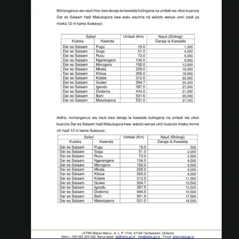 Mamlaka ya Udhibiti Usafiri Ardhini (Latra) imetangaza nauli za abiria kwa usafiri wa reli ya kisasa (SGR) kutoka Dar es Salaam hadi Dodoma. Kwa watu wazima, nauli itakuwa Sh 31,000, wakati watoto wa umri chini ya miaka 12 watalipa nusu ya gharama hiyo.