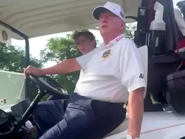 Trump concluded by asserting that it was just announced Biden might withdraw from the presidential race. He then drove off with Barron in the golf cart.